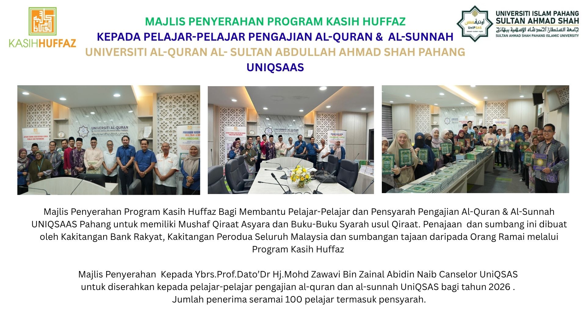 MAJIS PENYERAHAN MUSHAF QIRAAT SEPULUH DAN BUKU SYARAH USUL QIRAAT BAGI PELAJAR-PELAJAR USAS DISEMPURNAKAN PENYERAHAN KEPADA DEKAN FAKULTI PENGAJIAN ISLAM DAN SAINS SOSIAL USAS